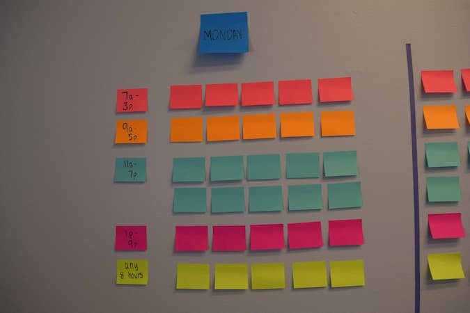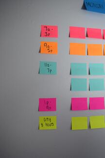 Turn one wall in the office into your calendar (yes, the entire wall.) Then, allow people with color coded sticky notes to claim their shift. In a call center environment, it can be hard to offer full workplace flexibility due to coverage. We recommend you conduct a poll. What are the 4 most common shifts people want?