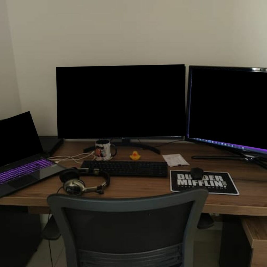 We love the mousepad inspired by The Office, three screens for productivity, and the comfortable desk chair in this minimalist work from home setup.